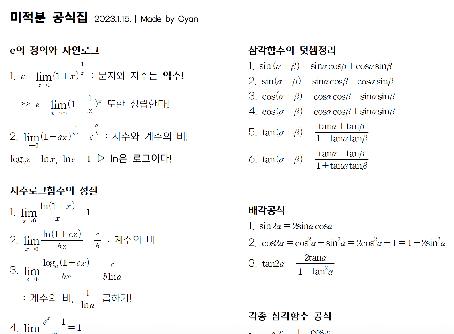 ๋ฏธ์ ๋ถ ๊ณต์์ง (์ง์๋ก๊ทธํจ์, ์ผ๊ฐํจ์์ ๊ทนํ๊ณผ ๋ฏธ๋ถ)์ ๋ฌด๋ฃ๋ก ๋ฐฐํฌํฉ๋๋ค.