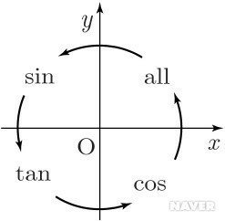 ์ ๊ทธ๋ฆผ์์ all: sin, tan, cos๋ก ์๊ฐํด์ ๊ฐ๊ฐ์ ์ฌ๋ถ๋ฉด์ ํด๋นํ๋ ์ผ๊ฐํจ์๊ฐ +, ๋๋จธ์ง๋ -๋ถํธ๋ก ํ๋ณํจ.