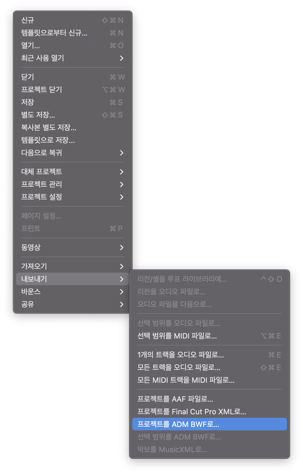 3. ์ž‘์—… ํ›„ ๋‚ด๋ณด๋‚ด๊ธฐ: ํŒŒ์ผ>๋‚ด๋ณด๋‚ด๊ธฐ>ํ”„๋กœ์ ํŠธ๋ฅผ ADM BWF๋กœ.. ์„ ํƒ