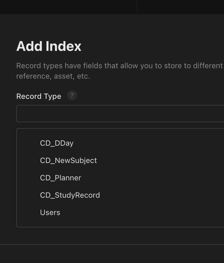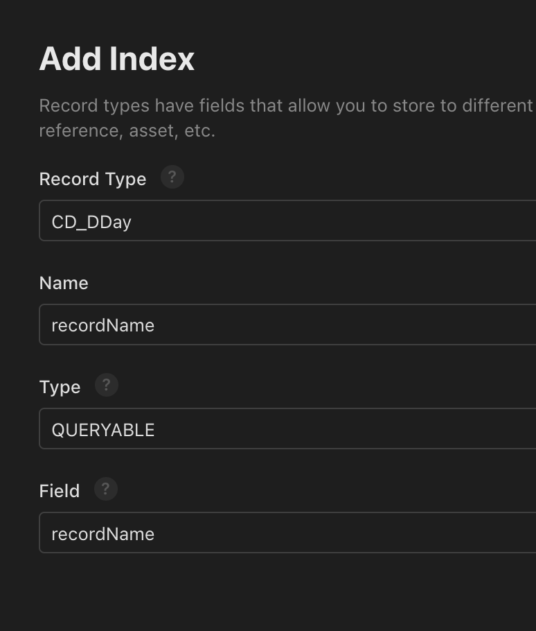 이 경우 Schema > Indexes에서 해당하는 Record Type을 선택한 후, 두 번째 이미지처럼 Queryable이 설정된 recordName을 만들어 주면 정상적으로 데이터를 확인할 수 있다.