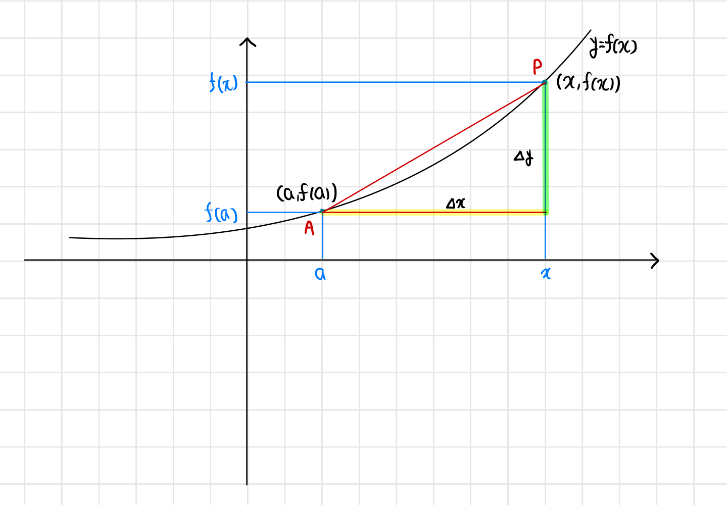 ํจ์ y=f(x)์์ x์ ๊ฐ์ด a์์ x๊น์ง ๋ณํ ๋์ ํ๊ท ๋ณํ์จ: $\frac{\Delta y}{\Delta x}=\frac{f(x)-f(a)}{x-a}=\frac{f(a+\Delta x)-f(a)}{\Delta x}$ = $\overleftrightarrow{AP}$์ ๊ธฐ์ธ๊ธฐ (ํ๊ท ๋ณํ์จ์ ๊ธฐํ์ ์ ์)