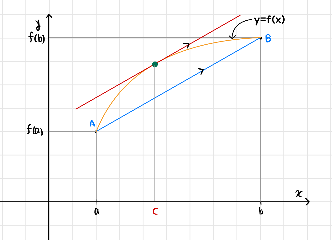 → $y=f(x)$ μμ λ μ $(a, f(a)), (b, f(b))$λ₯Ό μλ μ§μ κ³Ό ννν μ μ μ κ°λ μ μ΄ μ΄λ¦°κ΅¬κ° (a, b)μ μ μ΄λ νλ μ‘΄μ¬νλ€.